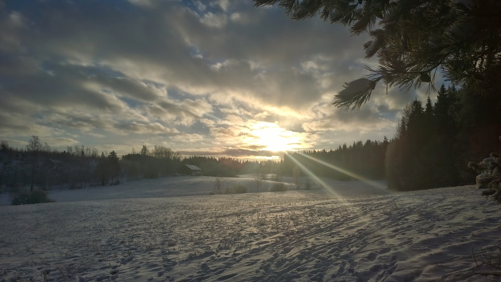Mä yritin sanoa, että kyllä meiltäkin voisi laittaa onnittelukuvan, semmoisen kauniin ja iloisen, missä me kirmataan Äiti-Disan kanssa valkealla hangella. Vaikka korpin perässä, niinku me tehtiin päivällä. Mut ei, kuvaa ei ehtinyt ottaa, kun muka puhui työpuhelua. Mut arvatkaa, kerkeskö haukkua meidät, kun tultiin takasin? No kerkes, ja murisikin mulle. Eikä me käyty kun tien tällä laidalla, ei ees yli menty, vaikka se korppi kovin houkutteli taas.