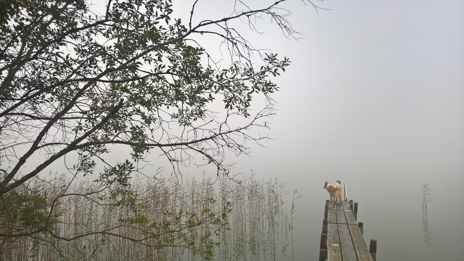 Elokuun viimeisen päivän aamu, sumu kadotti järven ja horisontin, huikeaa!