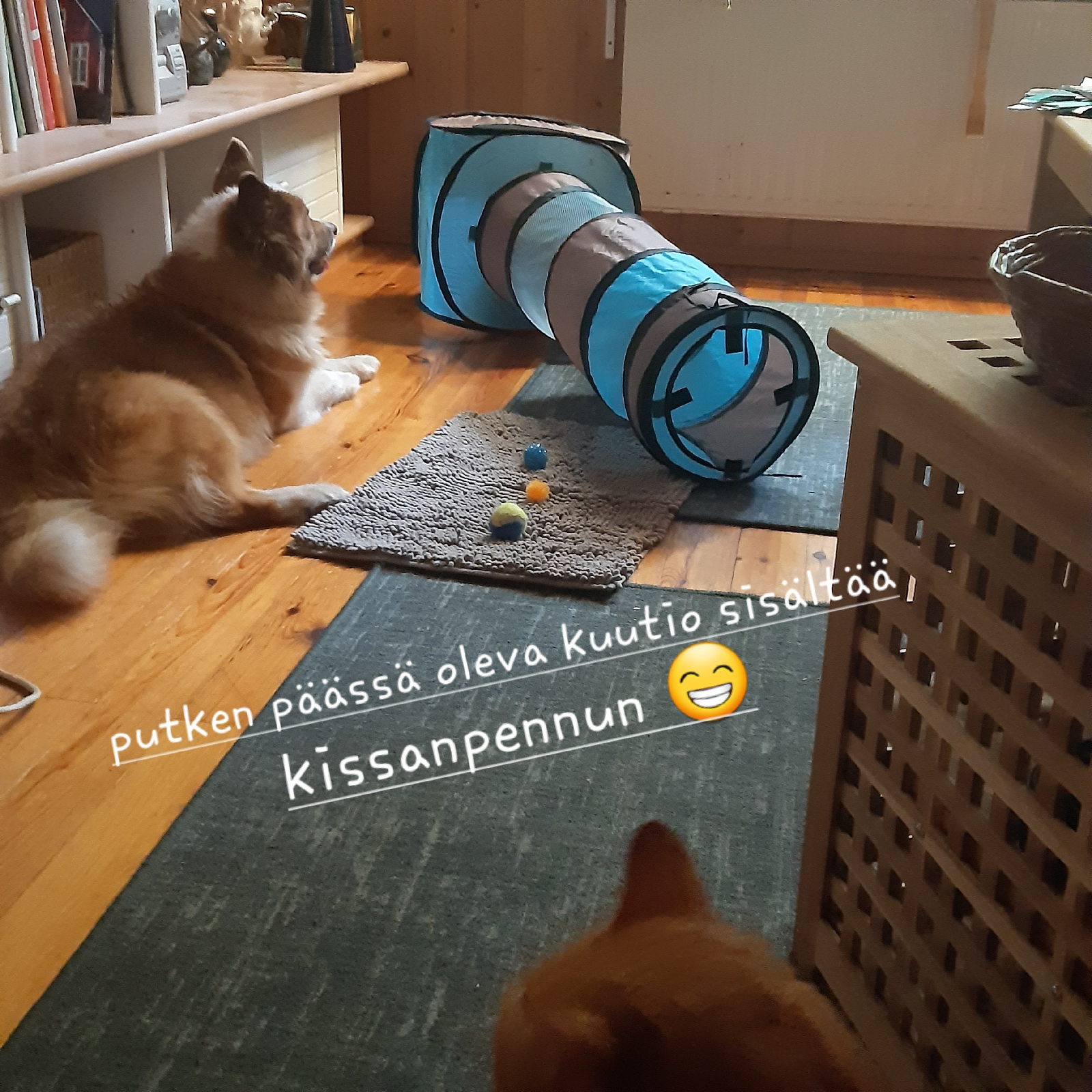 Sadepäivänäkin saa liikuntaa, kun se nyt kolmantena päivänään juoksee ympäriinsä ja koiratkin sitä rakastavat eikä sihinääkään enää kuulu.
